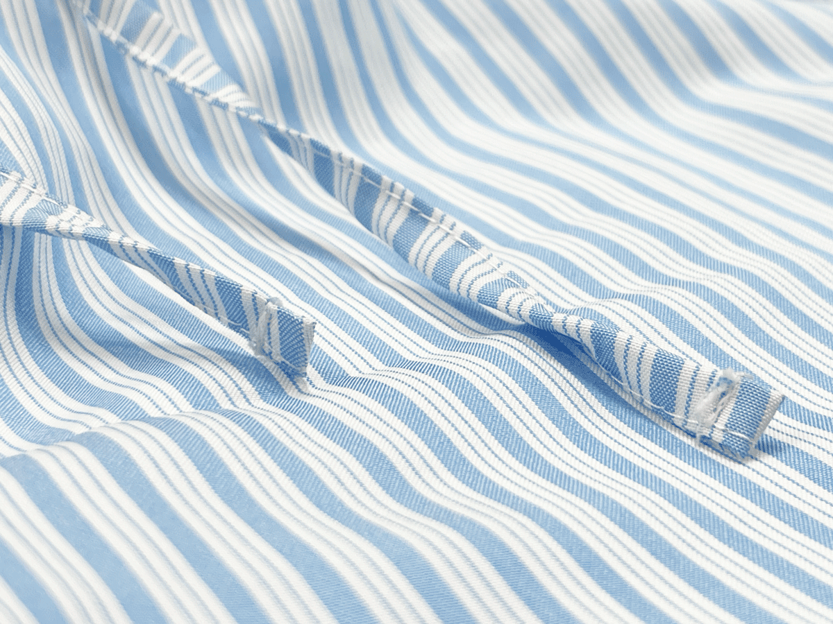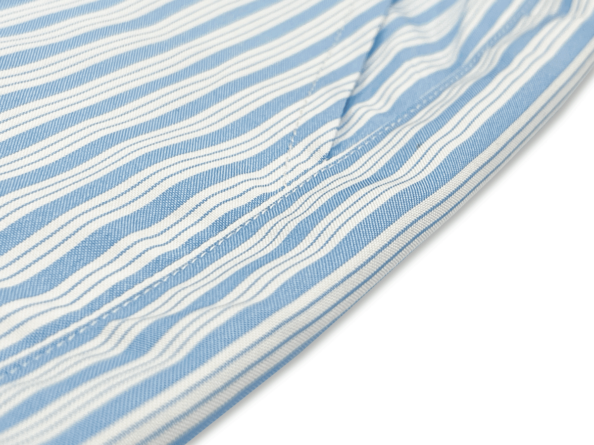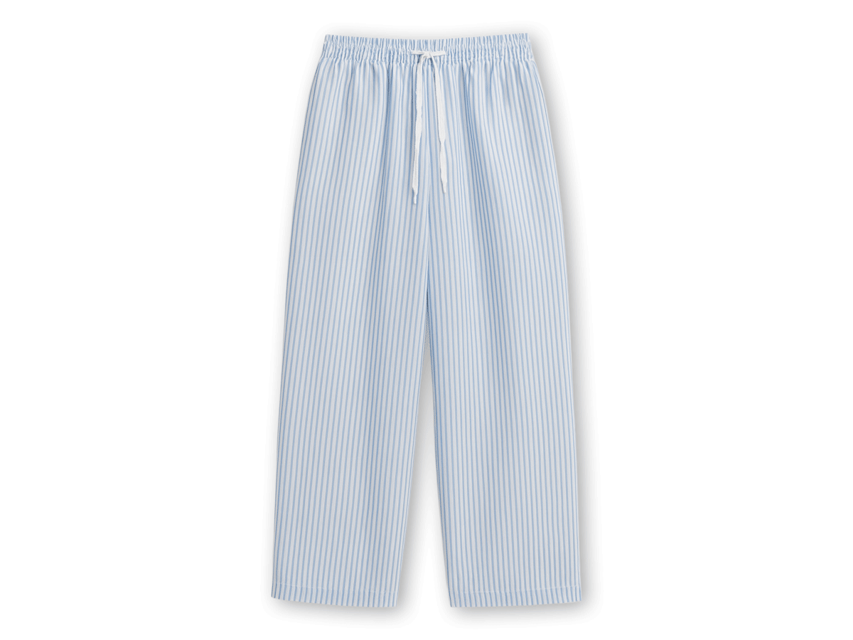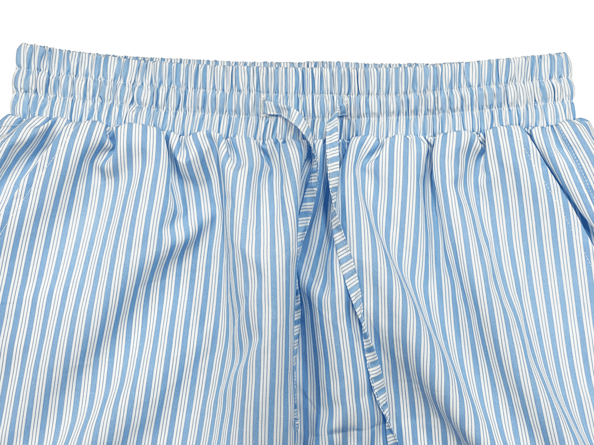 These baby blue striped pants feature a minimalist design with a relaxed wide-leg fit and an elastic waistband with drawstring for easy adjustment. Made from soft, breathable cotton, they’re perfect for lounging, resort wear, or casual strolls. Vertical stripes enhance the silhouette, creating a lengthening visual effect.The waistband features an evenly gathered elastic that gently hugs the waist without constriction. The self-fabric drawstring adds a subtle, coordinated detail while allowing for easy adjustment and versatility across different body types.The drawstrings are crafted from the same striped fabric as the pants, offering a refined and cohesive look. Slim and neatly finished, they provide effortless adjustability while maintaining a clean, minimalist aesthetic.The slanted side pockets are subtly integrated into the pant’s silhouette, offering both visual harmony and everyday functionality. Clean, precise stitching ensures structure while maintaining a sleek, low-profile look when worn.