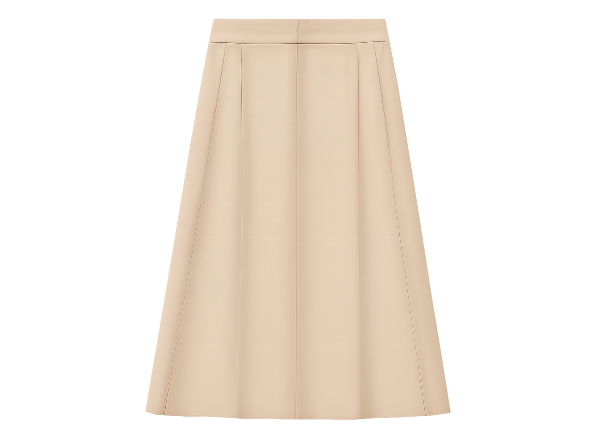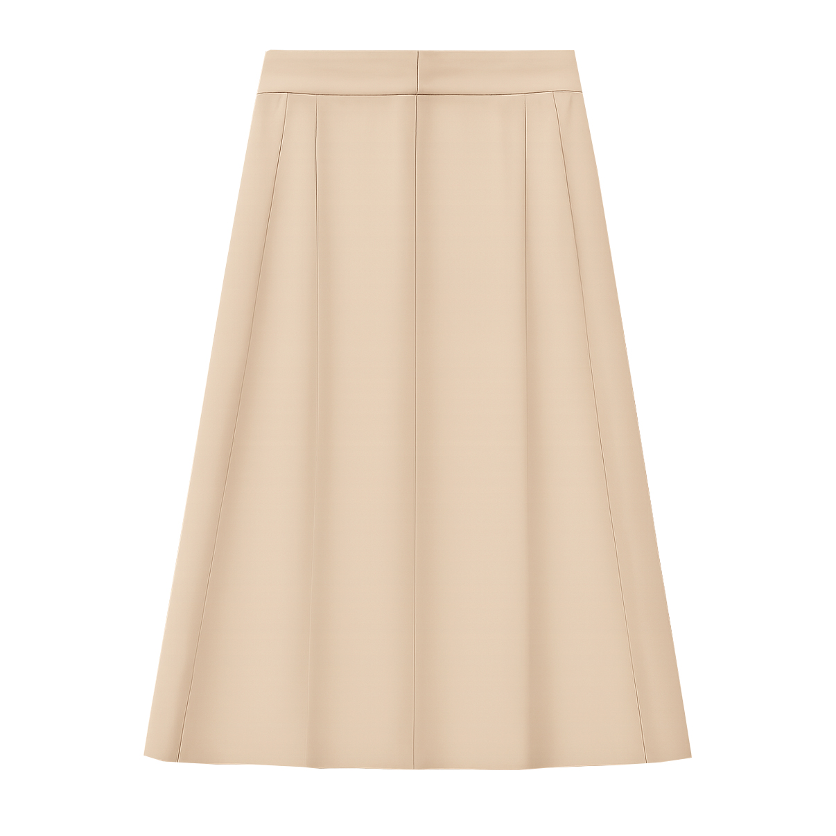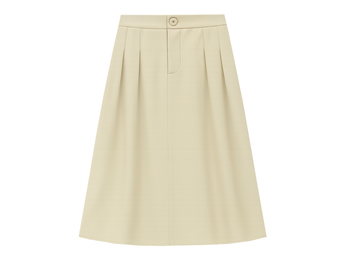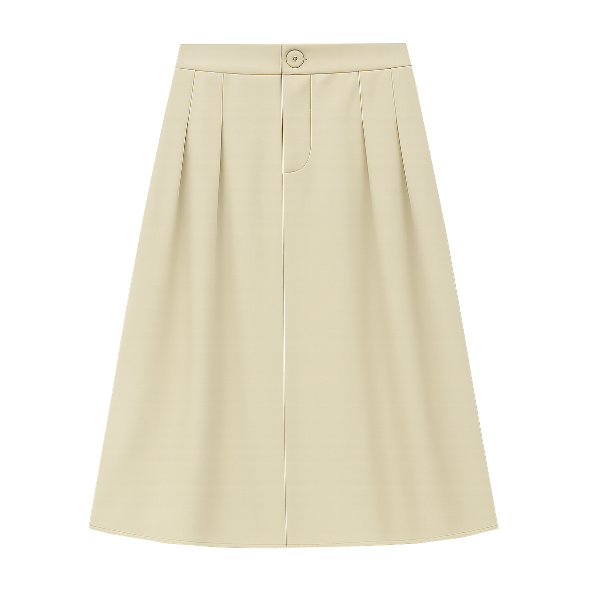 The front of the skirt showcases a subtle A-line shape, featuring a wide waistband neatly fastened with a button. Gentle pleats at the top highlight the waist and lend a soft drape to the skirt. Its lightweight, breathable fabric makes it suitable for both office wear and casual outings.