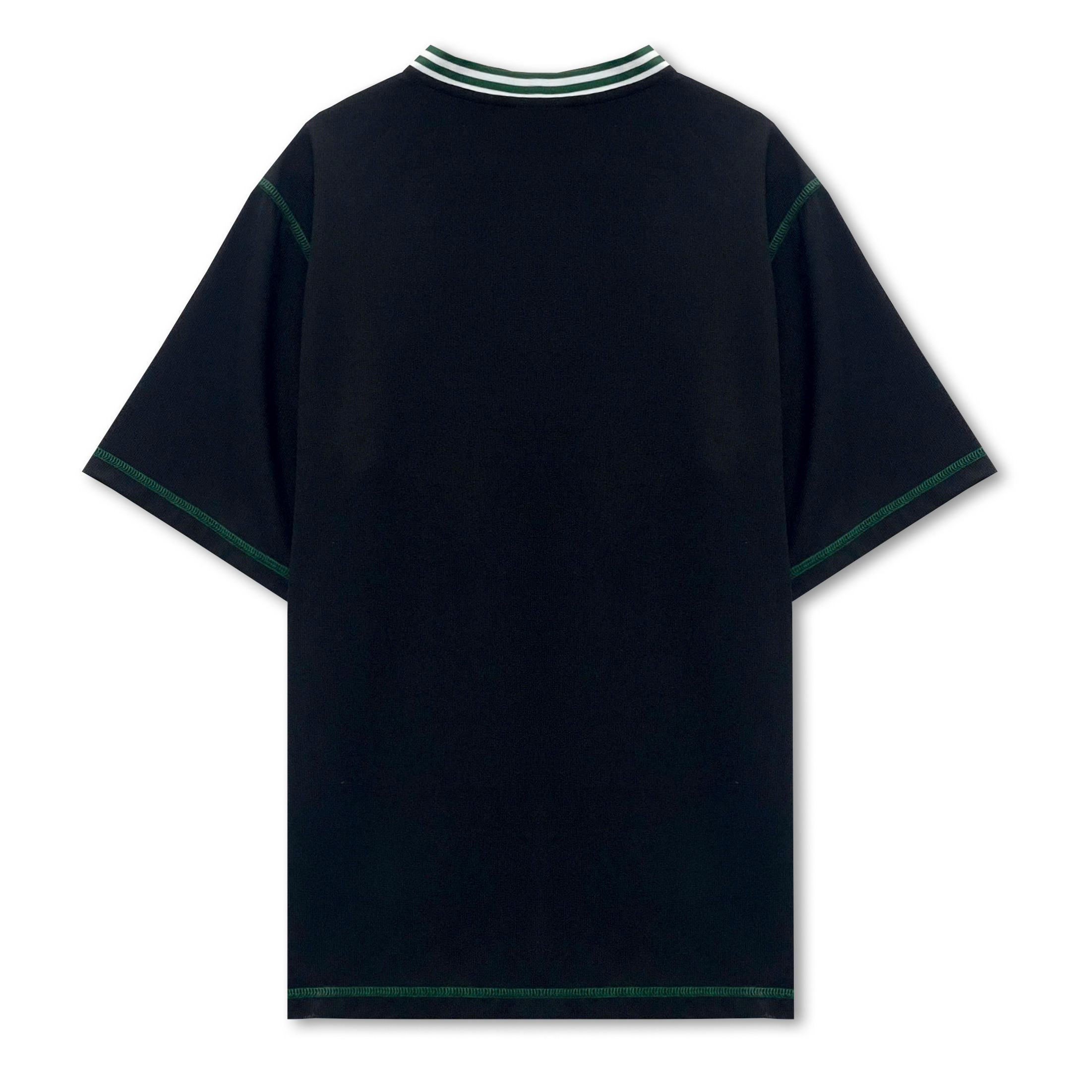 Inspired by the undefeated spirit of star athletes, the THE NO.1 ENERGY tee stands out with a modern oversized silhouette and a bold “1” graphic at the chest – not just a number, but a statement of leadership. Deep black tone paired with sporty green stitching and striped collar evokes a competitive field energy, while staying rooted in urban streetwear aesthetics.The back is kept clean and minimal to let the front design and striped collar steal the show. In deep black with green contrast stitching and a varsity-style striped neckline, this oversized silhouette blends athletic vibes with streetwear edge.Standout varsity vibes with the green-white striped V-neckline. The athletic-inspired design not only adds bold character but also refines the shoulder and neckline for a cleaner, sportier silhouette.The embroidered “1” at the center chest stands for leadership and the winning spirit in sports culture. Bold green stitching adds a visual punch, giving the minimalist design a unique and confident edge.The raglan shoulder design with exposed contrast stitching enhances mobility and gives the shirt an athletic varsity edge. The green seams don’t just stand out visually—they also reinforce the dynamic, sporty vibe of the whole look.