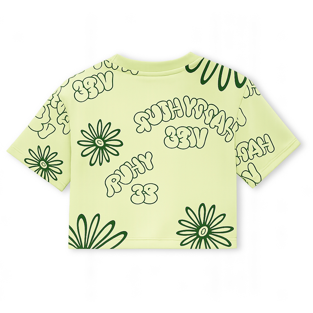 This avocado-green crop tee bursts with playful bubble lettering and retro floral prints, channeling a bold Y2K street vibe. Its bright color and soft fabric offer both standout style and all-day comfort—an instant summer favorite.The back mirrors the playful bubble letters and retro daisy prints, keeping the look vibrant from every angle. With a seamless front-back design, this tee stands out effortlessly—even in the simplest pairings.The crewneck is ribbed in matching tone, gently hugging the neckline while staying breathable. Clean stitching preserves the print flow, keeping the overall look seamless and effortlessly street-ready.The graphic uses high-resolution heat transfer printing, ensuring smooth adhesion without cracking or peeling over time. Colors stay vibrant and details sharp—even after multiple washes—making it ideal for bright, intricate Y2K-style designs.The sleeve hems are neatly stitched for a clean, structured look without discomfort. Slightly relaxed cut flatters the arms and allows easy movement. Seamless print flow from body to sleeve adds to the bold, energetic vibe.