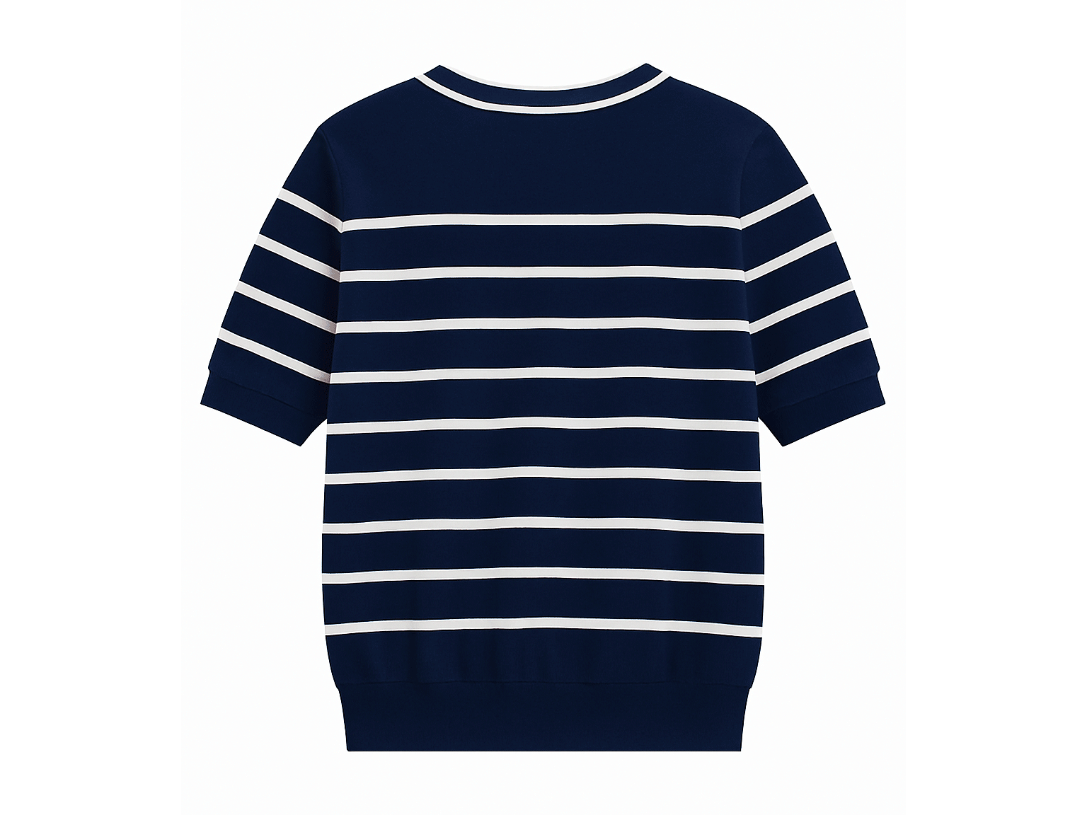 The back design features uniform horizontal stripes on a deep navy base, offering a cohesive and polished look that complements the button-up front effortlessly.