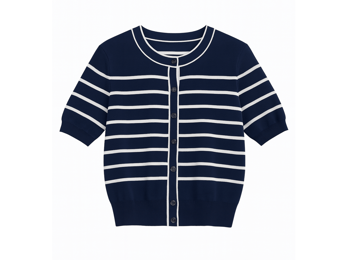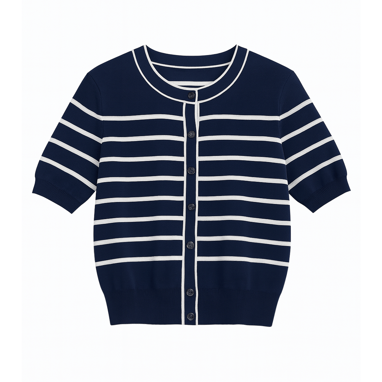 A playful nod to nautical charm, this navy knit cardigan features clean white stripes and a classic round neckline, offering a polished yet relaxed silhouette. The soft knit texture and button-down front make it an effortless layering piece for breezy days or casual outings.