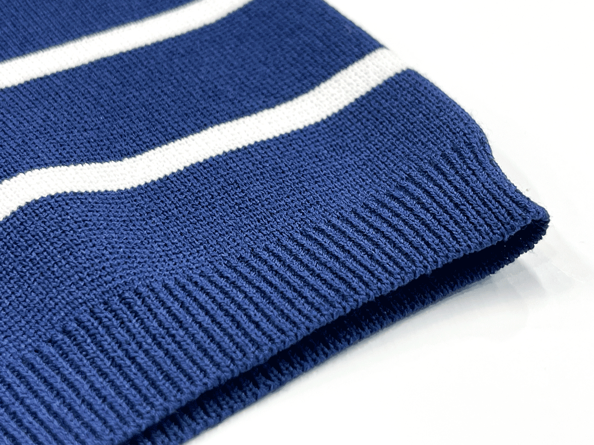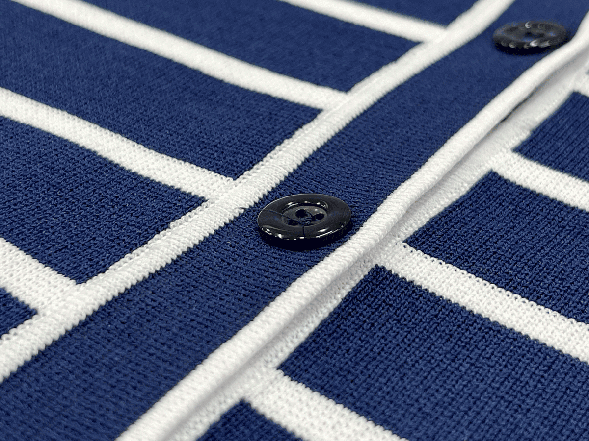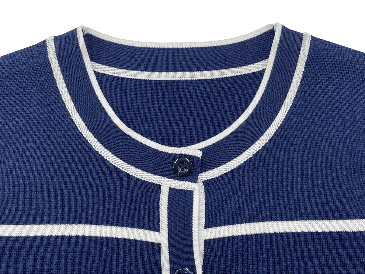 The rounded neckline is neatly constructed with contrast white piping, enhancing durability while highlighting the garment’s nautical-inspired charm. This detail adds structure and sophistication to the cardigan, making it ideal for both casual and polished looks.