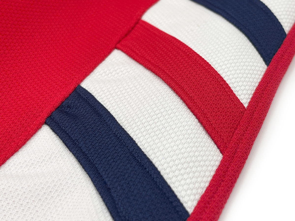 These pants are part of a matching sportswear set, designed with a slightly tapered fit for a sleek and dynamic look. The elastic waistband ensures flexibility and comfort during movement. The side panels feature a white fabric insert with blue and red horizontal stripes, adding a bold contrast. A zippered ankle detail provides adjustable