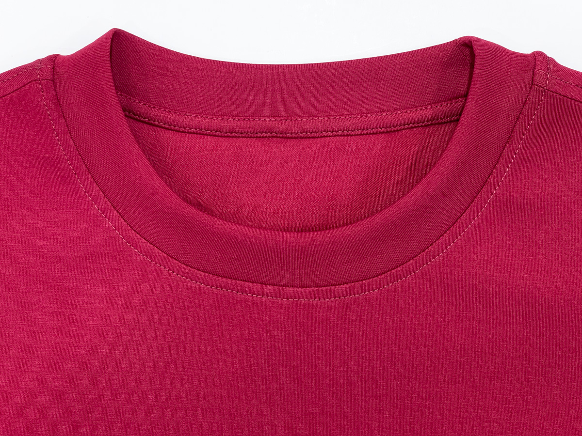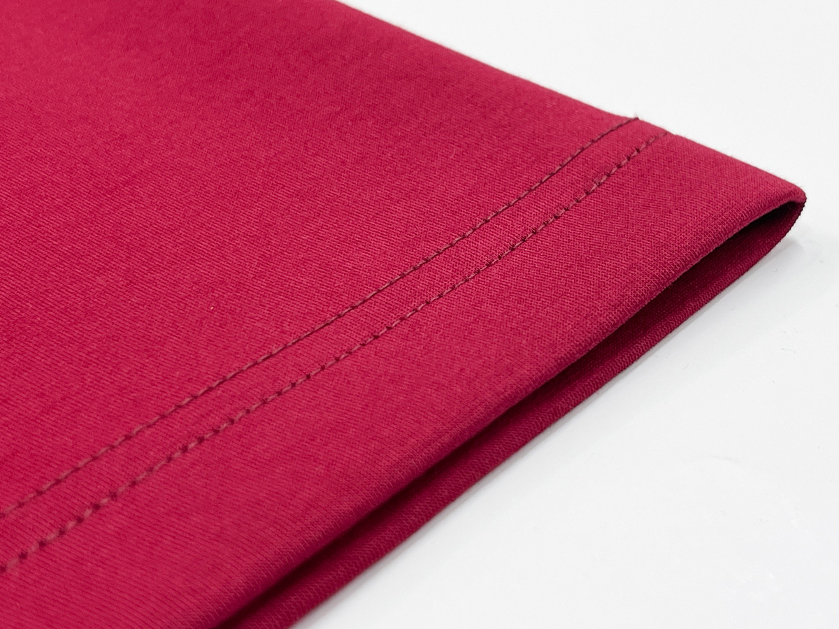 The sleeves fall in a clean, relaxed cut—basic in form, bold in tone. Crisp stitching keeps them structured, while the deep wine red gives even the sleeve its own presence.